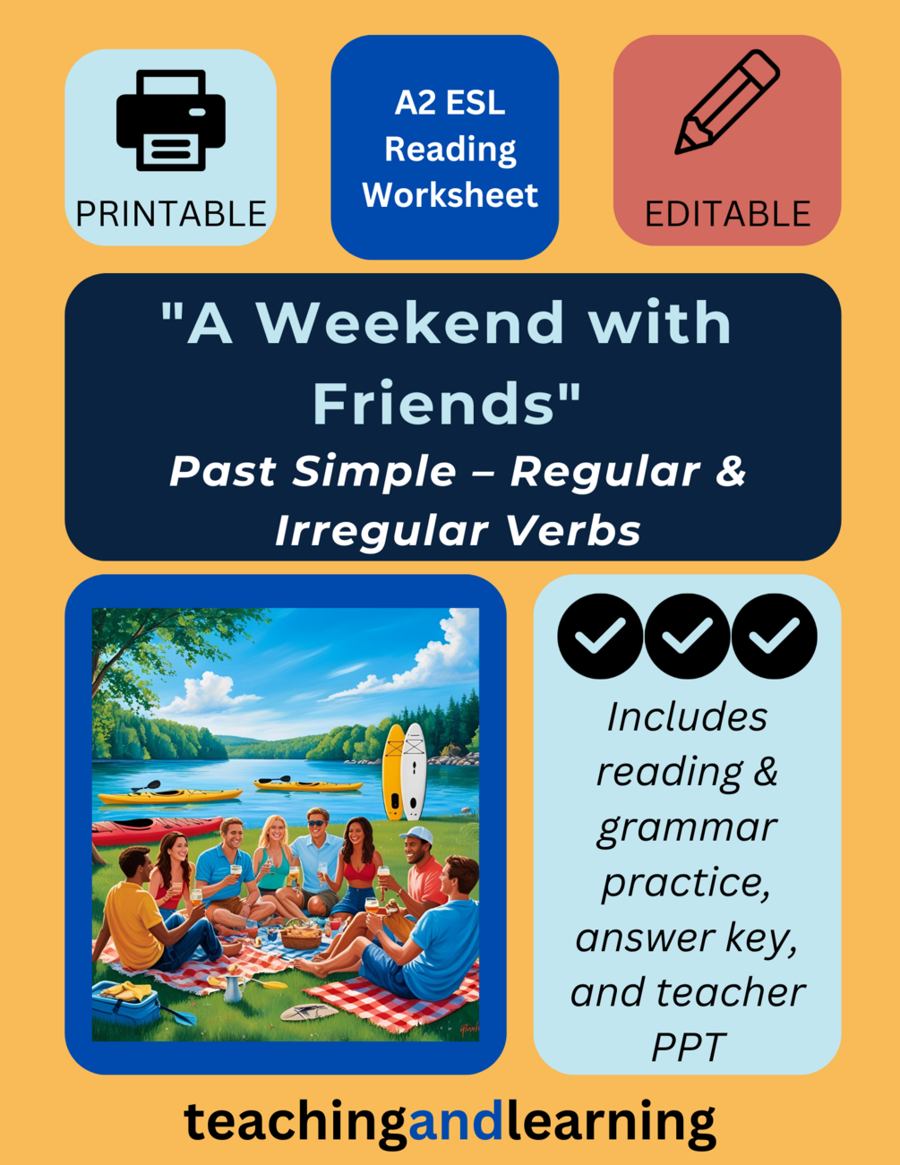 This bundle is centered around a short story titled "A Weekend with Friends" and focuses on the Past Simple tense (regular and irregular verbs). It includes everything you need for a complete lesson: